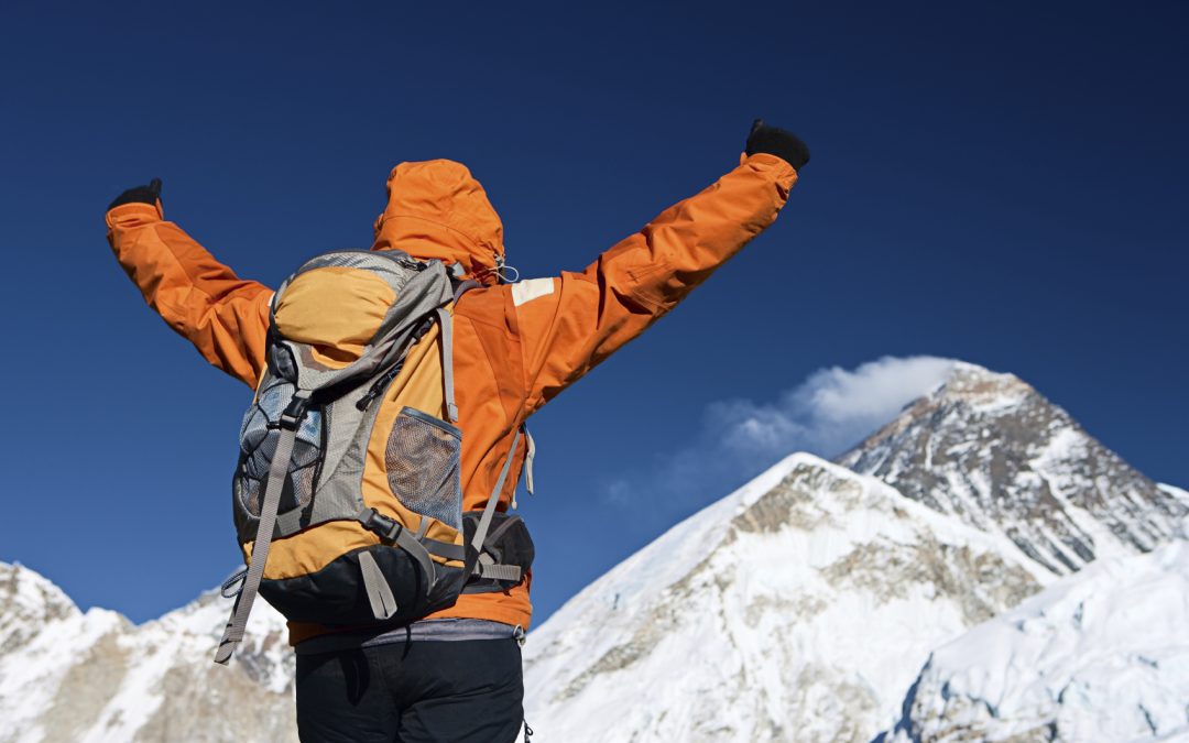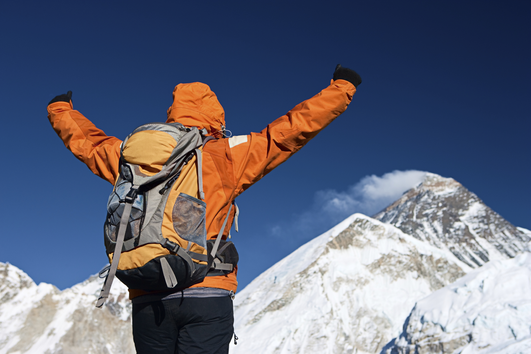 Female trekker looks over Himalayas
